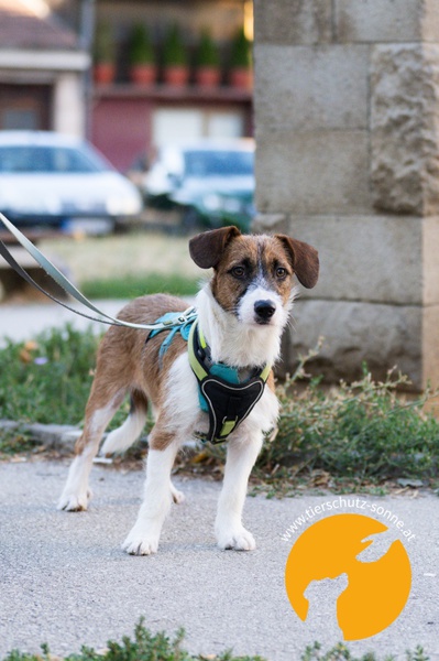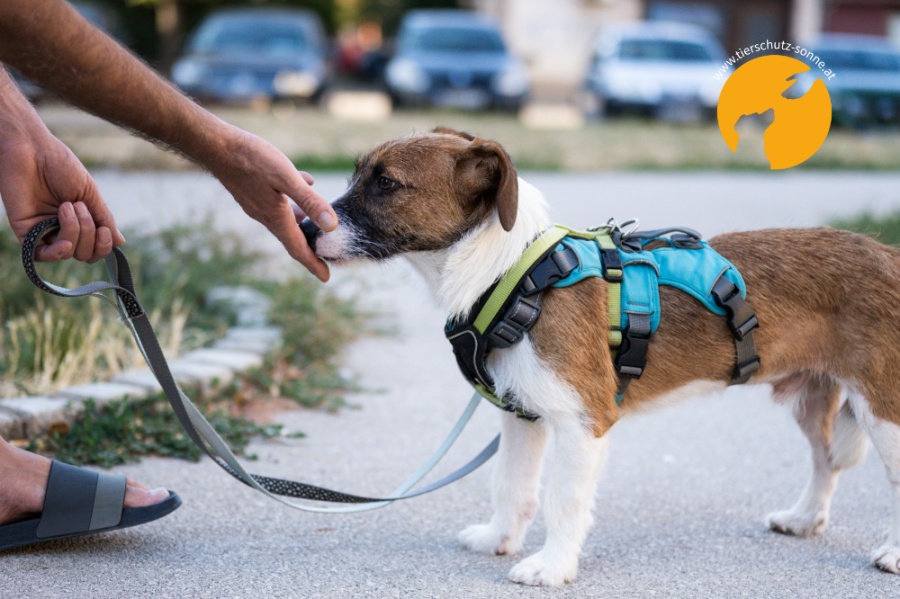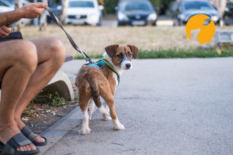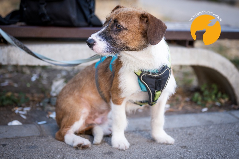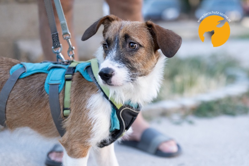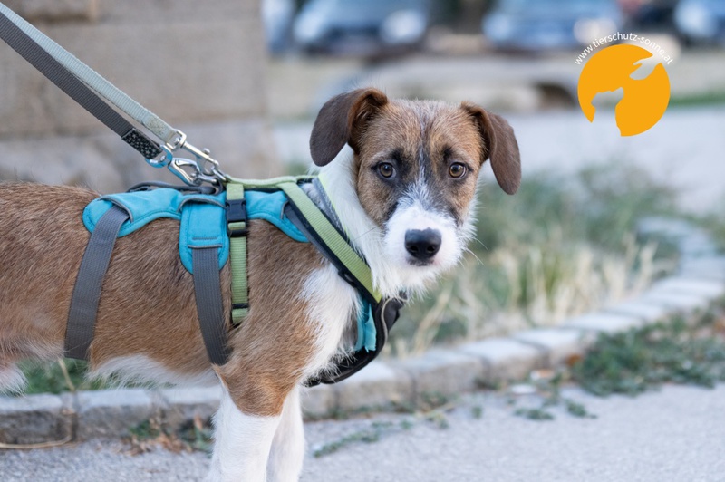 übersiedeln konnten. Neo ist gemeinsam mit Schwester Berta seit Juni 2025 auf einer Pflegestelle und lernt dort das Zusammenleben mit Menschen und anderen Hunden.